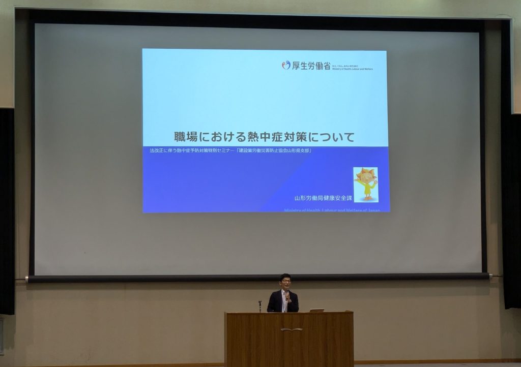 セミナーでは、山形労働局 阿久津健康安全課長から「職場における熱中症対策について」と題して、熱中症による労働災害の発生状況や規則改正の内容等についての説明をいただきました。
